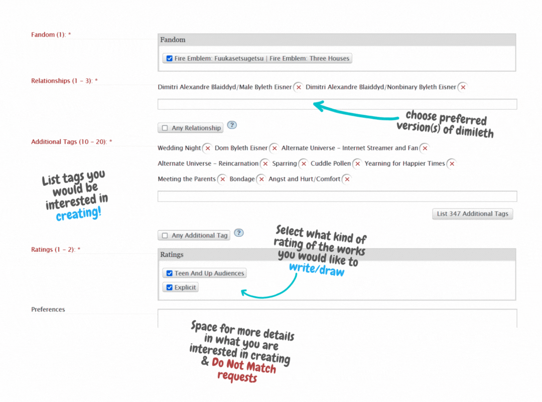 Fandom field: You have to check Three Houses here. That doesn’t mean you’re opting out of Three Hopes, it’s just AO3 weirdness.Relationships field: Use this field to indicate which versions of Byleth you’re interested in creating for. For example, if you’re happy to create for any version of Byleth, you would put all three available relationship tags in this field.Additional Tags field: List things you would be interested in creating! If you run out of space you’re welcome to add a second offer. Avoid offering tags that you’re only interested in under very specific circumstances, as your recipient may have a different interpretation.If the tag list is too overwhelming, or you’re interested in too many tags: if you select “Any” and use the Optional Preferences field to describe broadly what you’re interested in creating, we'll match you based on your text. (Note that this is the only field we're doing special handling for Any on.)Ratings field: If you only want to create SFW, only select T. If you only want to create smut, only select E. To offer both SFW and NSFW, select both T and E. Your work does not need to match the exact rating you offered, this field is just for offering SFW versus NSFW.Optional Preferences field: You can add additional notes on what you’re interested in creating here, such as any broad tonal preferences that may not be captured in your tags, or things you really don't want to create. We’ll check these for incompatibility when reviewing the AO3-generated matches.You are guaranteed to be matched to someone who requested at least one of the relationships + additional tags + ratings you offered. They may have other prompts that don’t match anything you offered. If there’s something you would find highly distressing to read, such as prompts for noncon scenarios, let us know here and we will do our best to make sure your assignment doesn’t include it at all.