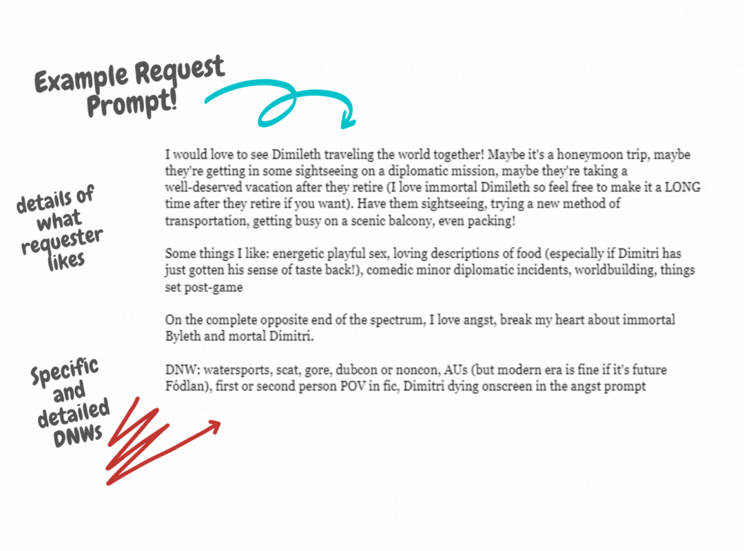 Please be as specific as possible with your DNWs as it will save everyone a lot of grief later on. You never need to give a reason for a DNW. However, DNWs that are vague, create an impossible request, or attempt to box a gifter into making one specific thing for you will be ignored.[What if I want different tags for different Byleths?] 💬
