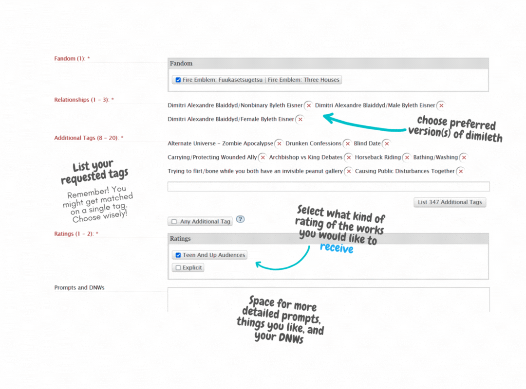 Additional Tags field: It’s like a prompt, except you’re guaranteed to match to someone who offered at least one of the tags you requested! Because you might match on a single tag, avoid requesting tags that you would only enjoy in conjunction with one of your other tags: that’s better suited to the prompts field.Ratings field: This field is for opting into SFW and NSFW rather than exact ratings. If you only want SFW gifts, only select T. If you’re here for smut, only select E. To indicate you’re fine receiving either SFW and NSFW, select both T and E.Prompt Text field: Use this field for more detailed or specific prompts, things you like, and your Do Not Wants (DNWs). Your gifter must create something that matches one of your requested relationships, one of your additional tags, does not include any of your DNWs, and falls into a rating you requested (SFW or NSFW), but they aren't required to follow your exact prompt text: it's best to list multiple things you'd enjoy rather than one very specific scenario. Please don't specify whether you'd like fic or art. Try to write prompts that work for both.