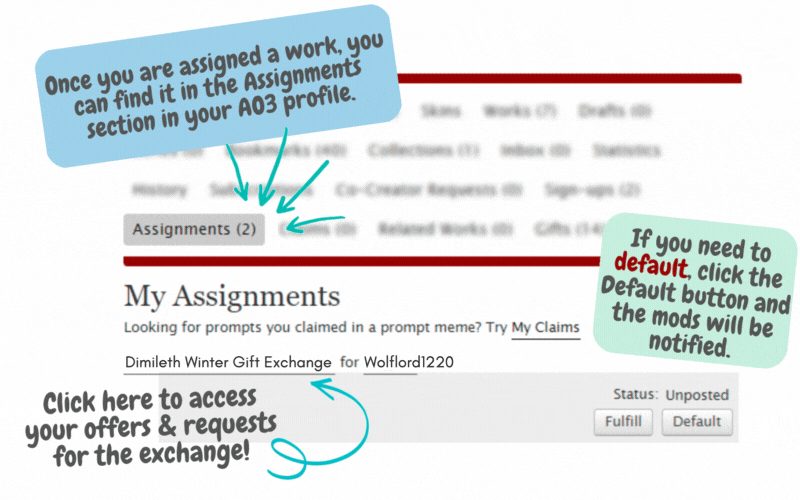 If you realize you won't be able to complete your assignment, default in AO3 as soon as you can. Defaulting earlier gives the pinch hitter more time to work. No need to tell us why you're defaulting. Life happens!