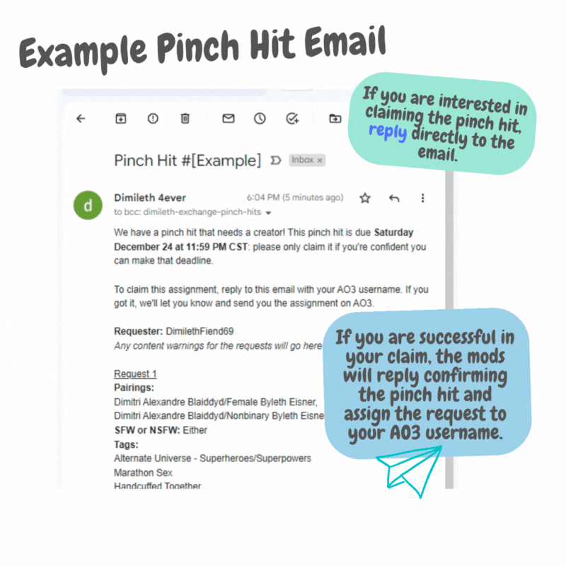If you would like to claim the pinch hit, you would reply directly to the post with your AO3 username in the body of the email.