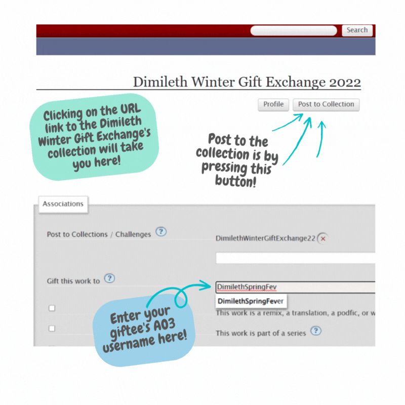 To make sure the treat is part of the exchange and revealed with the other works, go to the exchange's AO3 page and click "Post to Collection" - this will take you to the new work page with DimilethValentinesExchange25 filled in as the collection.