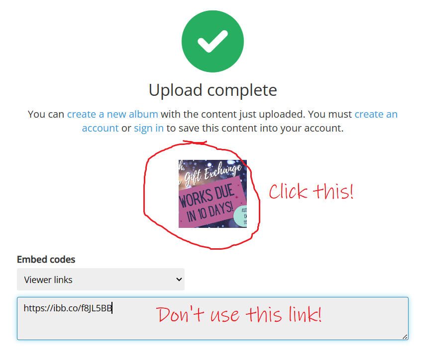 Sites like imgbb will give you a link to the imgbb page, not the actual image. All of imgbb's pregenerated link options are set up to get people to jump to imgbb instead of embedding the full image for viewing.To get an image link to give to AO3, open your image's imgbb page and right click the full image, then select "Copy image link" (or use "Open image in new tab" to launch the image in a tab where you can copy its URL from the address bar.)Image links will end with an image file extension, such as .jpg or .png.