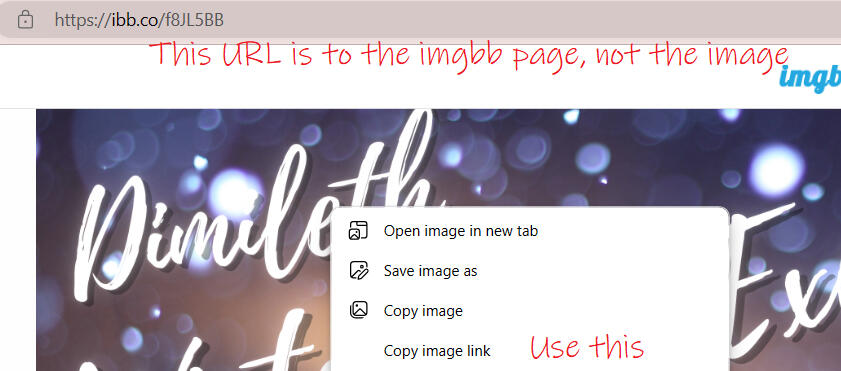Make sure you use the link to the actual image, not the link to the hosting page! If you're not sure what the difference is, see below for how to get your image link off imgbb.